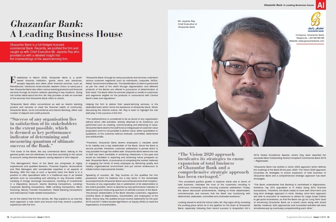 Ghazanfar Bank has been awarded as Most Outstanding Sharia Compliant Bank of Afghanistan -2018 By Acquisition International “UK Based Organization “…