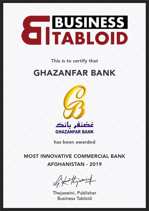 Ghazanfar bank has been conferred with the award for “Most Innovative Commercial Bank” in Afghanistan in 2019 by “Business Tabloid”, UK, London. http://www.btabloid.com/ …